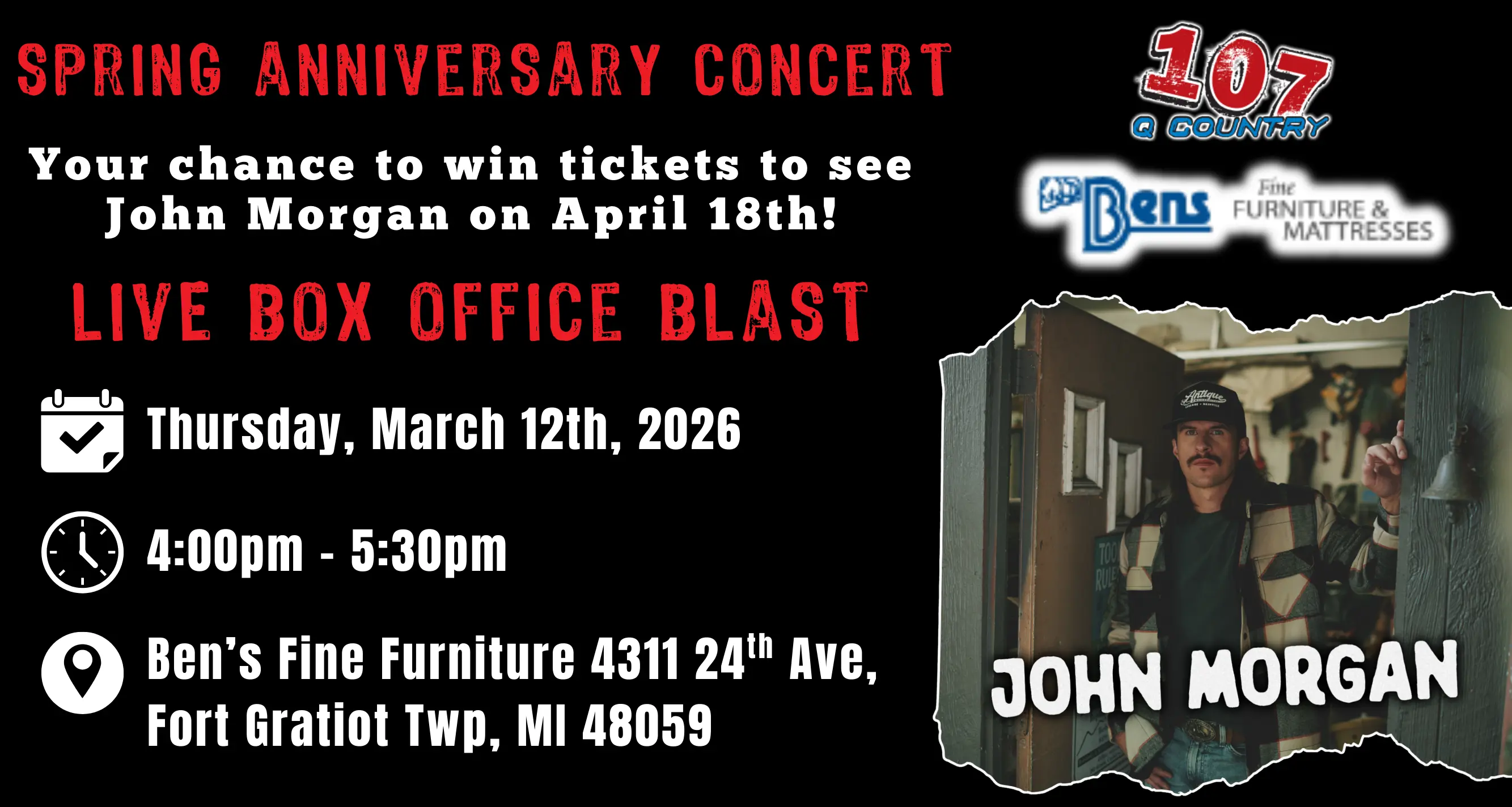 During a LIVE Box Office Blast, we’ll broadcast live from a local business for an hour and a half with your chance to show up, sign up, and hopefully win! We’ll do a mix of both VIRTUAL and LIVE, and to find out when the next one is, keep listening to Q Country 107! Good luck!