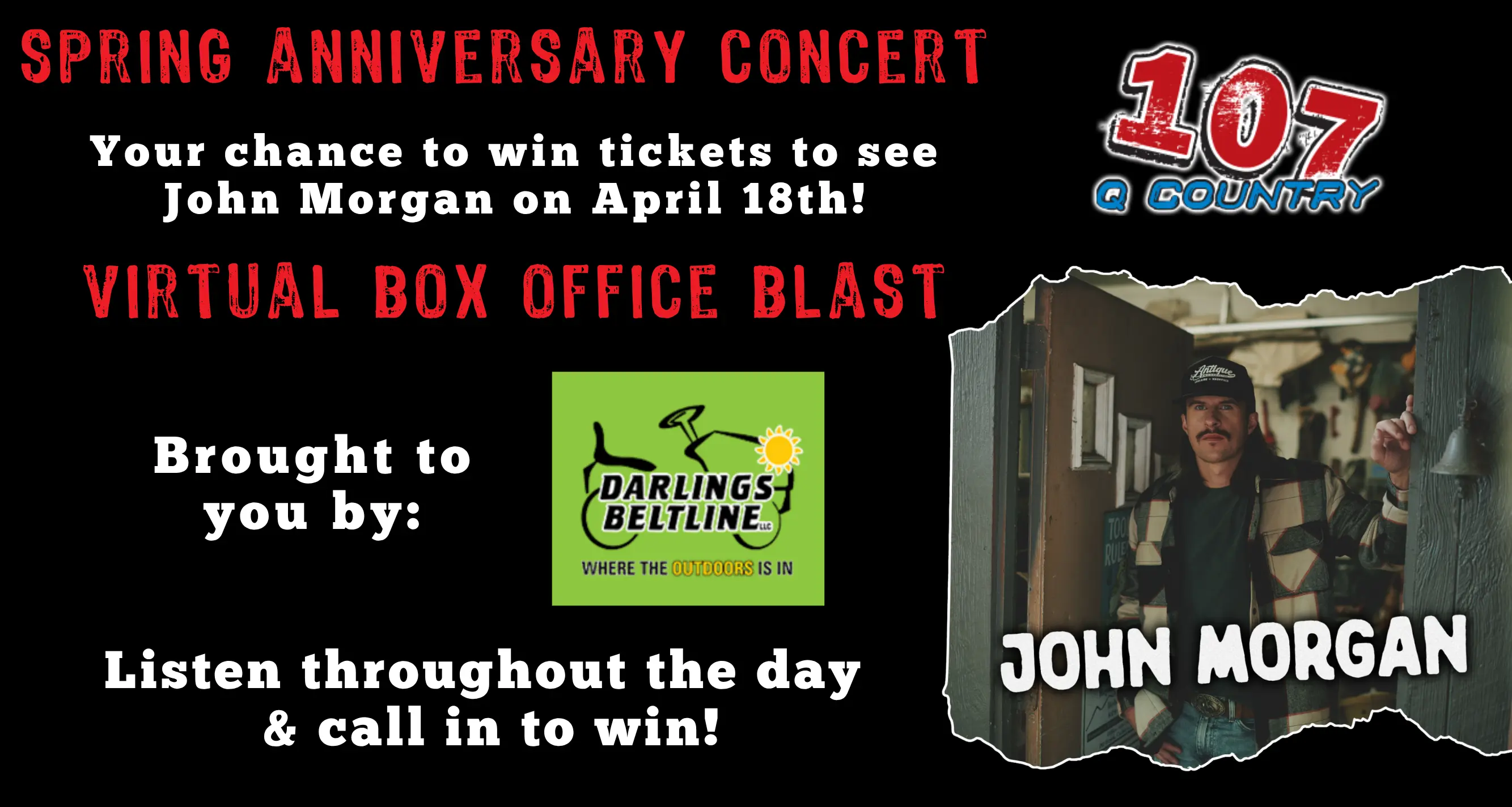 During a LIVE Box Office Blast, we’ll broadcast live from a local business for an hour and a half with your chance to show up, sign up, and hopefully win! We’ll do a mix of both VIRTUAL and LIVE, and to find out when the next one is, keep listening to Q Country 107! Good luck!