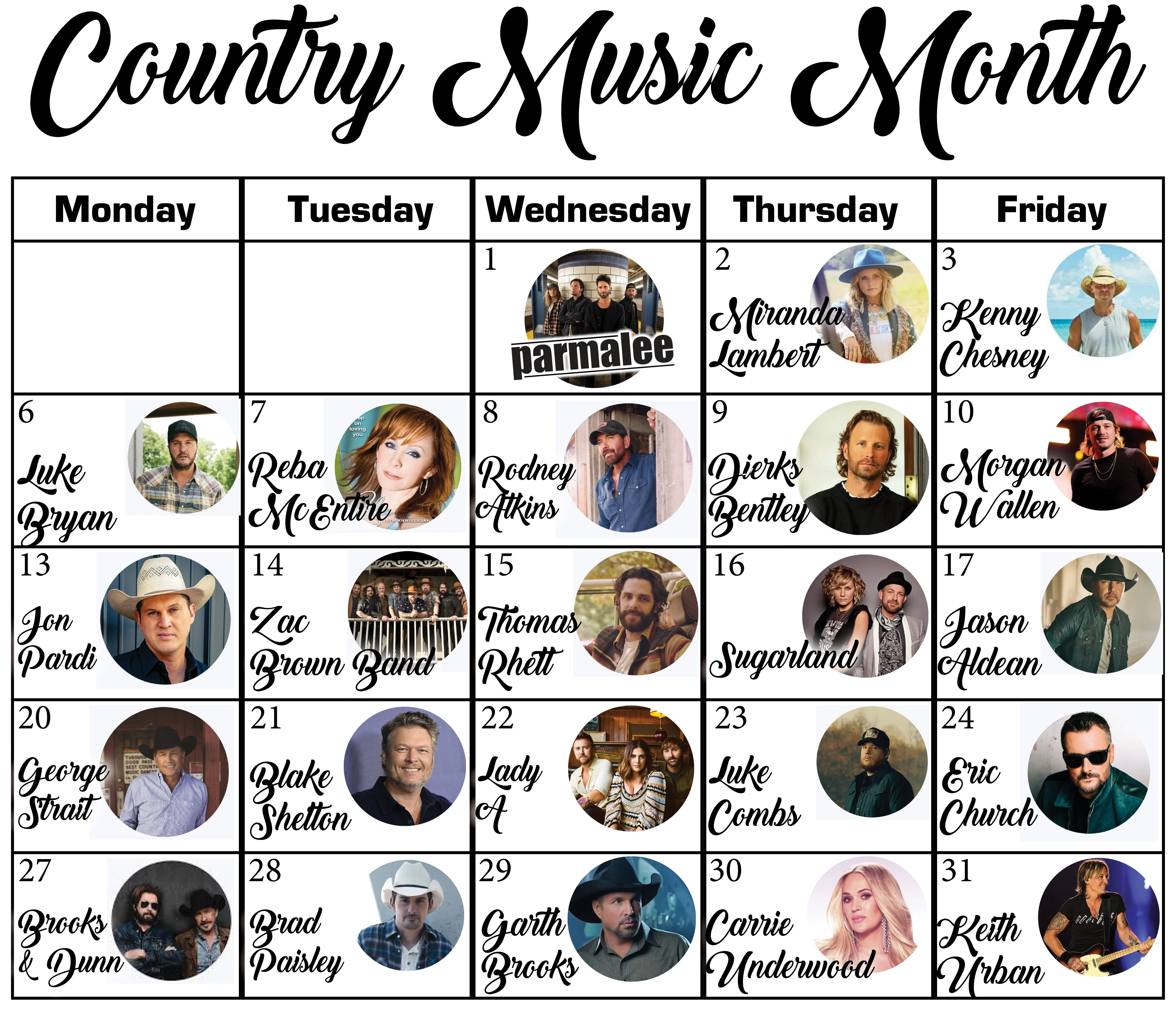 October is Country Music Month! Each weekday this month, you’ll have a chance to win $107.10! Each weekday, we’ll have a ‘featured artist of the day’ and play music by that artist throughout the day. At the top of each hour from 7a to 5p, you’ll have a chance to be caller 7 and guess which song is about to play by that artist – if you guess correctly, you win $107.10!