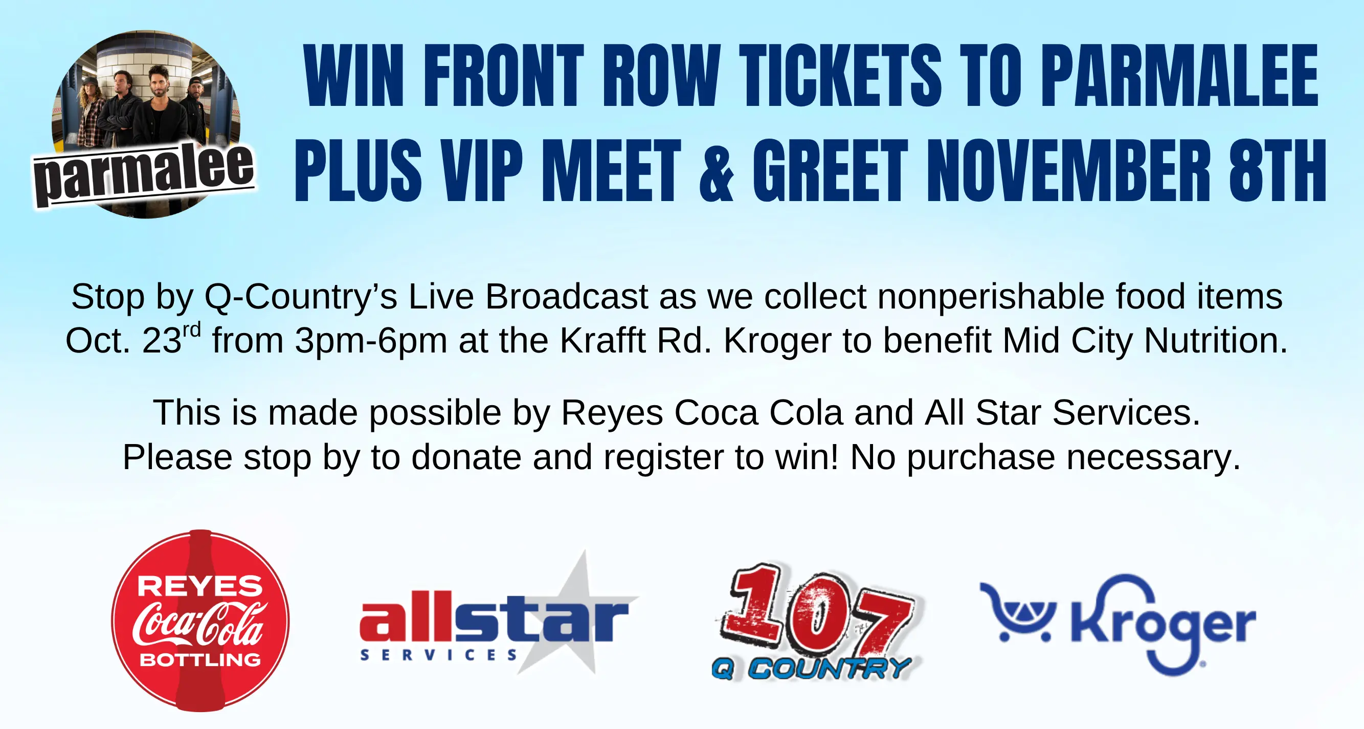 Wanna sit FRONT ROW for our Parmalee Concert on Saturday, November 8th? Stop by the North End Kroger on Thursday, October 23rd while we broadcast LIVE from 3 to 6! If you bring a non-perishable food item, we’ll load into an All-Star Vending Services truck and donate it to Mid-City Nutrition! That donation will get you entered to win FOUR front row tickets to the concert, plus a VIP Meet & Greet! All of this is brought to you by Reyes Coca-Cola! Stop by on Thursday the 23rd!