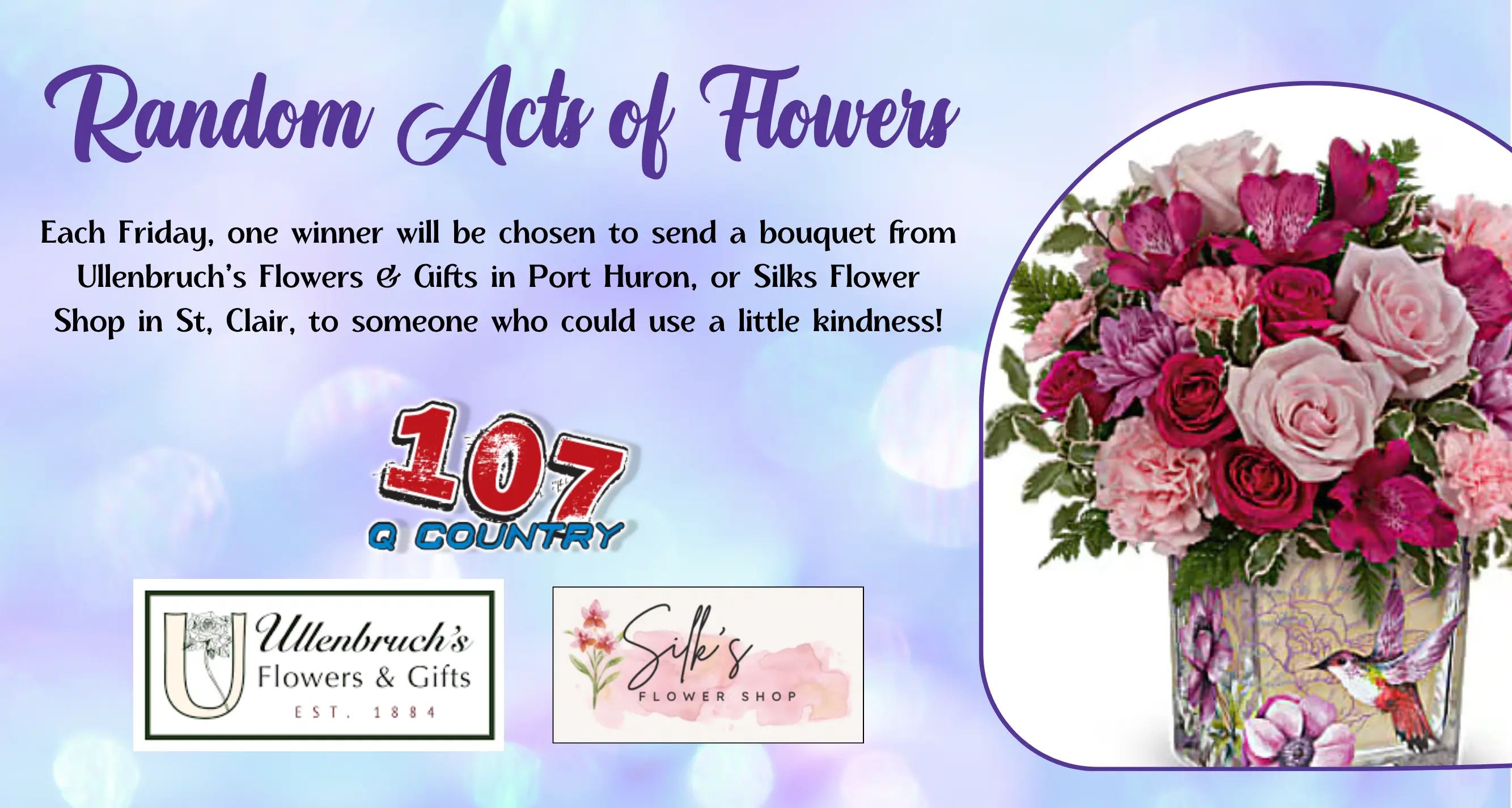 Enter our Random Acts of Flowers giveaway for a chance to spread joy each week! Every Friday, one winner will be selected to receive a beautiful bouquet from their either Ullenbruch’s Flower & Gifts in Port Huron, or Silks Flower Shop in St. Clair!